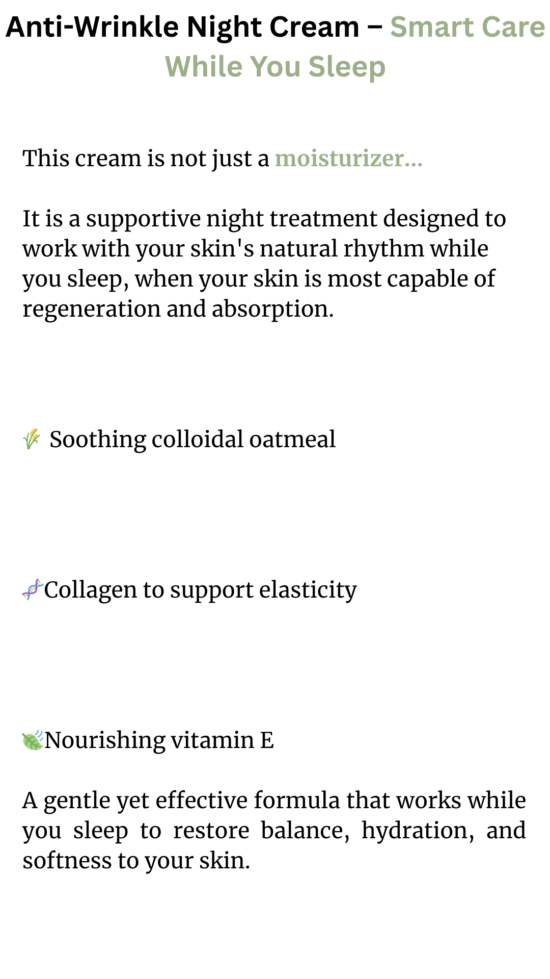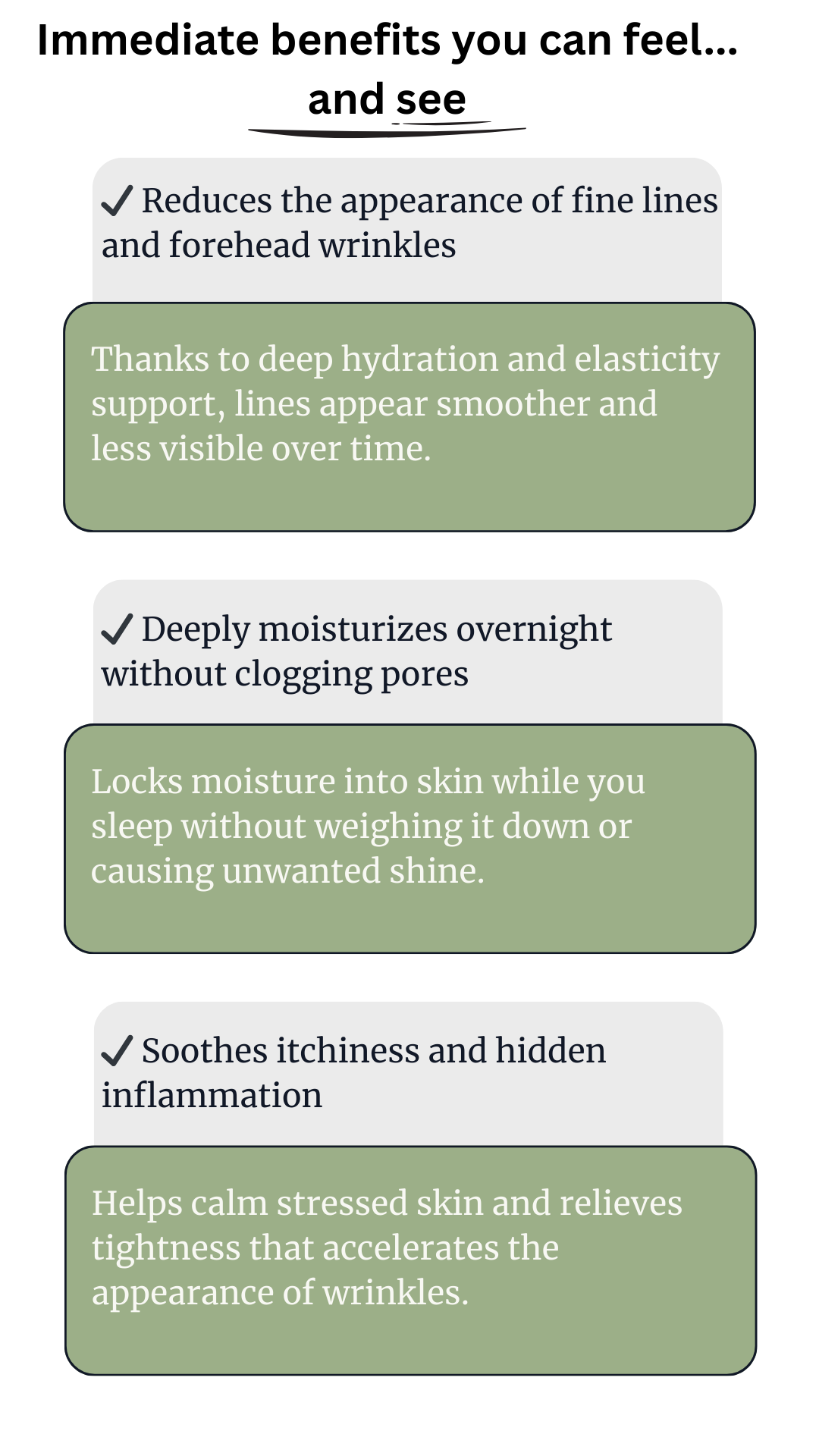 Because the difference here is not in the promise, but in the formula. This cream does not rely on temporary surface hydration, but on carefully selected ingredients that work with the skin to soothe it, support its elasticity, and provide a healthy environment in which the appearance of lines gradually improves.